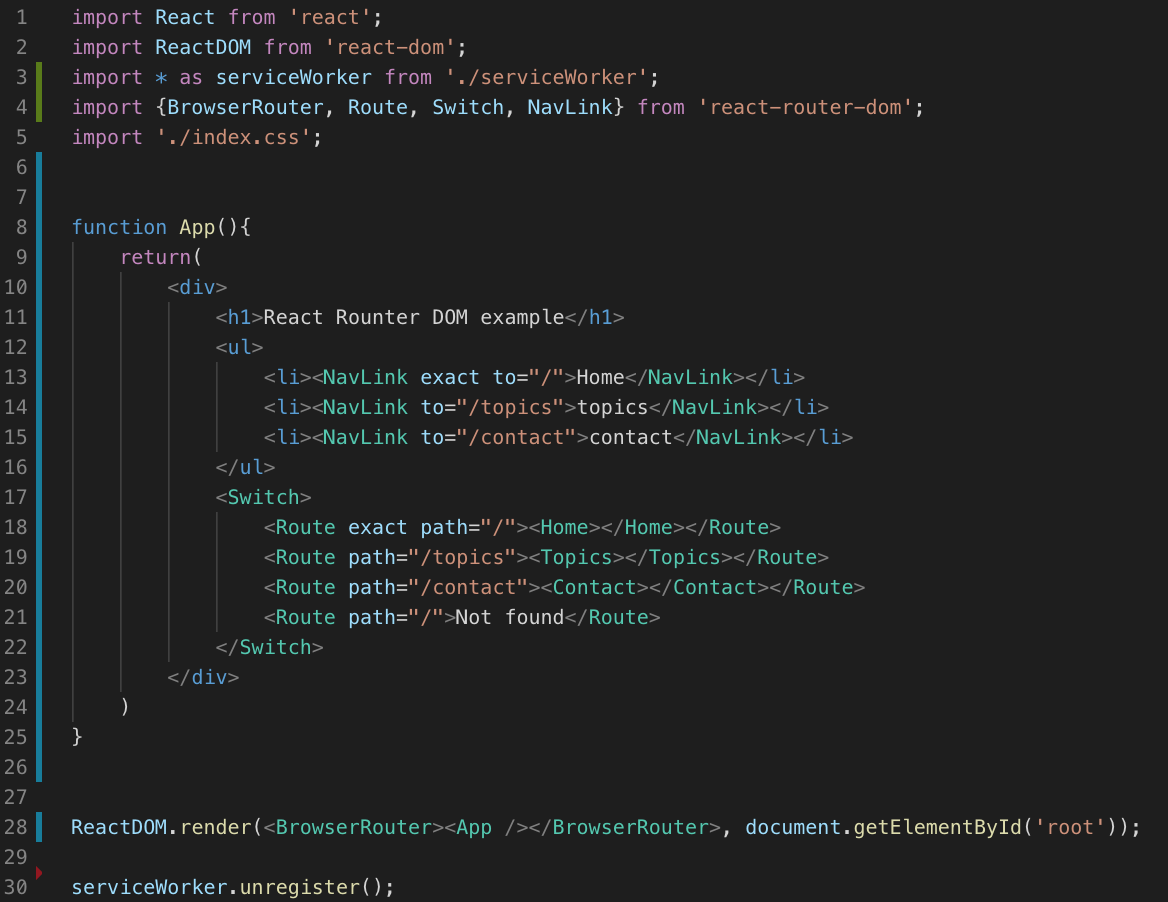 그후 Switch 와 Router을 통해 해당 경로가 들어오면 각각 Home, Topics, Contact의 컴포넌트를 불러오라고 지정했습니다.